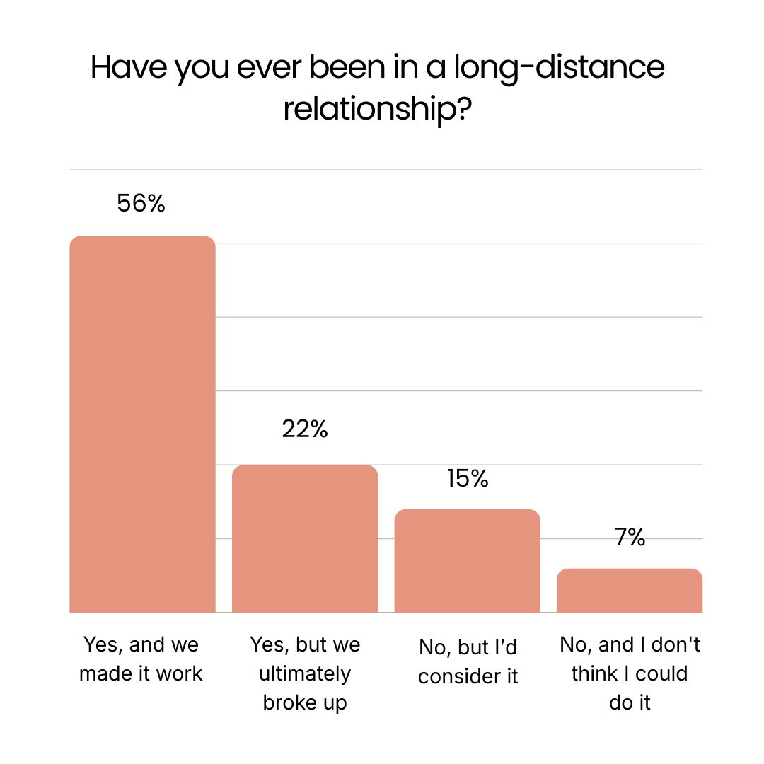 56% of you have been in a long-distance relationship and made it work, which made my heart so happy to see. Another 22% tried but it didn't survive, and 15% said they'd consider it. 7% have ruled it out entirely.